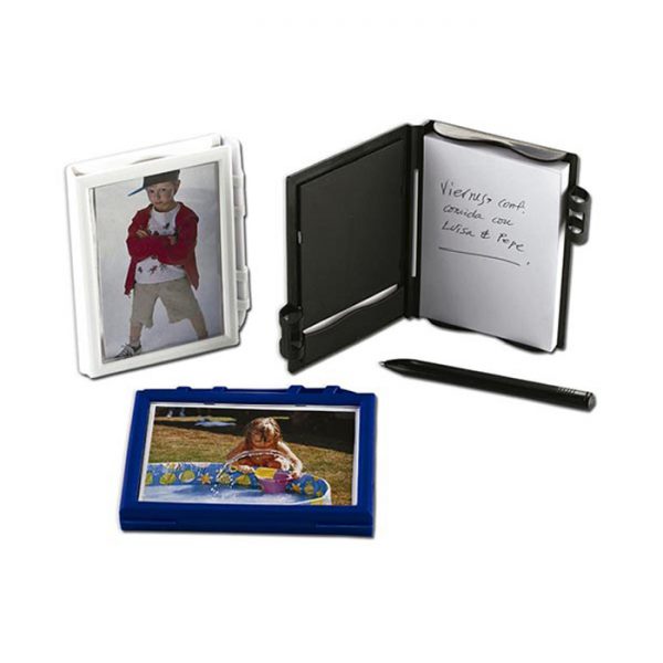Libreta funcional integrada con portaretrato, combinando utilidad de escritura con capacidad de personalización visual. Diseño innovador que permite exhibir fotografías, imágenes corporativas o mensajes visuales mientras se mantiene acceso a espacios de anotación.
